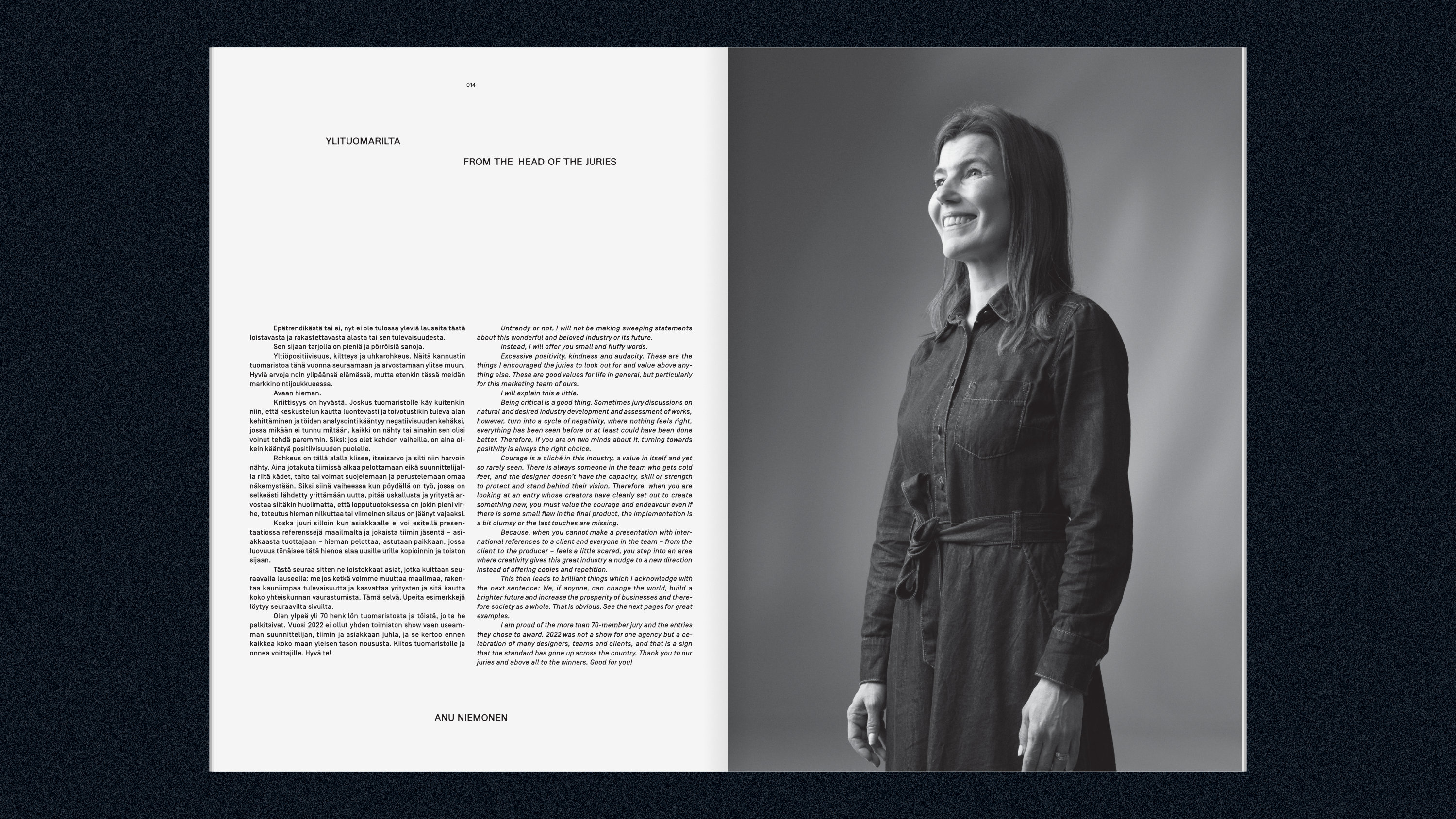 In a dialogue with AI, Ellun Kanat created the visual identity for creative design competition Vuoden Huiput. All features, such as grid, text, recognisability and the generativity of the animation style were inspired by the attributes of the used AI tools. As the outcome is coherently surreal, the discussion between artificial and general visual worlds becomes exploratively poetic.